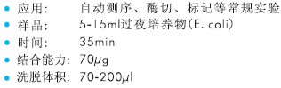 適合于從5-15ml培養(yǎng)過夜的細(xì)菌培養(yǎng)液中抽提高達70µg的質(zhì)粒DNA,填補了小量抽提與中量抽提之間的空白。純化的質(zhì)??梢灾苯佑糜谧詣訙y序、限制性內(nèi)切酶酶切以及PCR 、標(biāo)記以及體外轉(zhuǎn)錄等實驗。