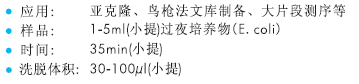 小提試劑盒適合于從1-5ml細(xì)菌培養(yǎng)液中純化大分子量的質(zhì)粒載體,或各種BAC,PAC,粘粒,Cosmid等載體。細(xì)菌收集后,加入Buffer T1/T2裂解,再加入Buffer T3離心沉淀去除蛋白質(zhì)和染色體DNA,在得到的上清液中加入獨(dú)特的結(jié)合液并轉(zhuǎn)移至結(jié)合柱進(jìn)一步去除蛋白質(zhì),經(jīng)過簡單的兩次洗滌即可得到高純度的BAC/PAC/P1等大片段質(zhì)粒DNA。