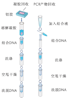 該試劑盒包含兩套回收方案,如需從多個條帶中回收某一特定條帶,可采用膠回收步驟,需將目的DNA片段從瓊脂糖凝膠上切下,溶膠后再回收DNA片段。如只需從PCR產(chǎn)物或酶促反應(yīng)液中回收純化DNA片段,可采用液相純化回收步驟。一個試劑盒滿足多種需求,簡單方便。同時,該試劑盒采用微量結(jié)合柱,最小洗脫體積可降低為10μl,適合微量DNA回收實驗。