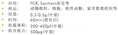 該試劑盒采用中量DNA結(jié)合柱純化方式,適合于從富含脂肪,多糖,纖維(如腦、脂肪、肌肉或肝臟)等樣品中提取DNA。另外,該試劑盒也適用于提取軟體動物、昆蟲、節(jié)肢動物或無脊椎動物樣品中富含粘多糖的組織 。一次可處理高達500mg的樣品。 組織樣品在含有CTAB的高鹽溶液中裂解然后經(jīng)過蛋白酶消化,加入氯仿抽提后離心溶液分層,吸取上清加入Buffer BL調(diào)節(jié)結(jié)合條件,然后加入到硅膠柱中結(jié)合。 經(jīng)兩步快速洗滌后去除鹽和其他雜質(zhì),最后加入Elution Buffer或滅菌水洗脫基因組DNA。純化的DNA可直接用于酶切、PCR或雜交等下游實驗。
