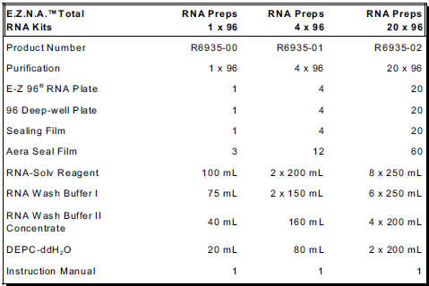 E.Z.N.A.® Total RNA Kit II (R6934)一樣的原理,該試劑盒專門(mén)設(shè)計(jì)高通量地從96個(gè)培養(yǎng)細(xì)胞樣品或動(dòng)物軟組織樣品中提取總RNA。每一個(gè)孔可處理高達(dá)5x106培養(yǎng)細(xì)胞或<30mg的動(dòng)物組織或 <50mg的植和組織。純化的RNA可直接用于各種下游應(yīng)用。