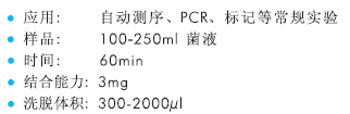 該試劑盒使用傳統(tǒng)的堿裂解法和磁珠純化方式相結(jié)合,適合于從200-250ml的菌液中純化1-2mg高純度的質(zhì)粒DNA,以及 BACs, PACs、粘粒等大片段的質(zhì)粒DNA。純化所得質(zhì)??梢灾苯佑糜跍y(cè)序、標(biāo)記、酶切等下游操作。